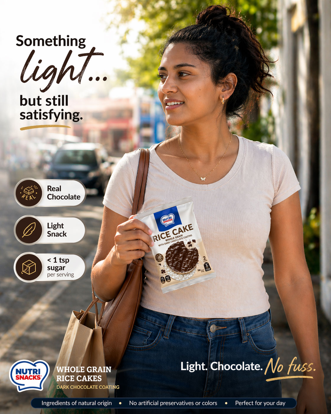 All the chocolate you want. None of the heaviness. Crispy whole grain rice cakes, coated in real semi-sweet chocolate—made for those moments when you want something delicious, quick, and just right.